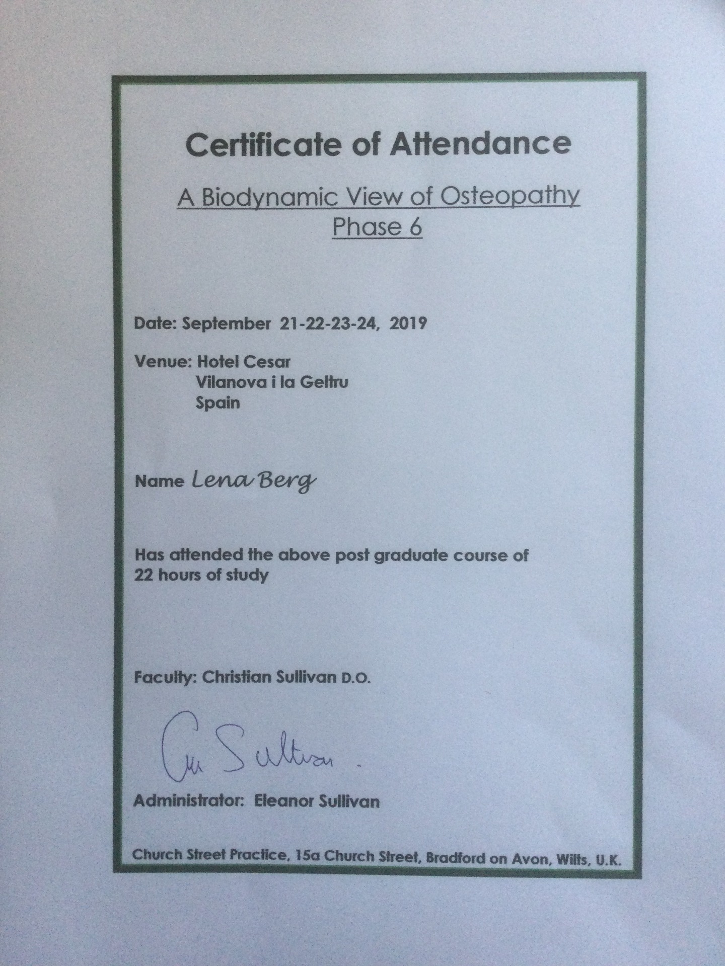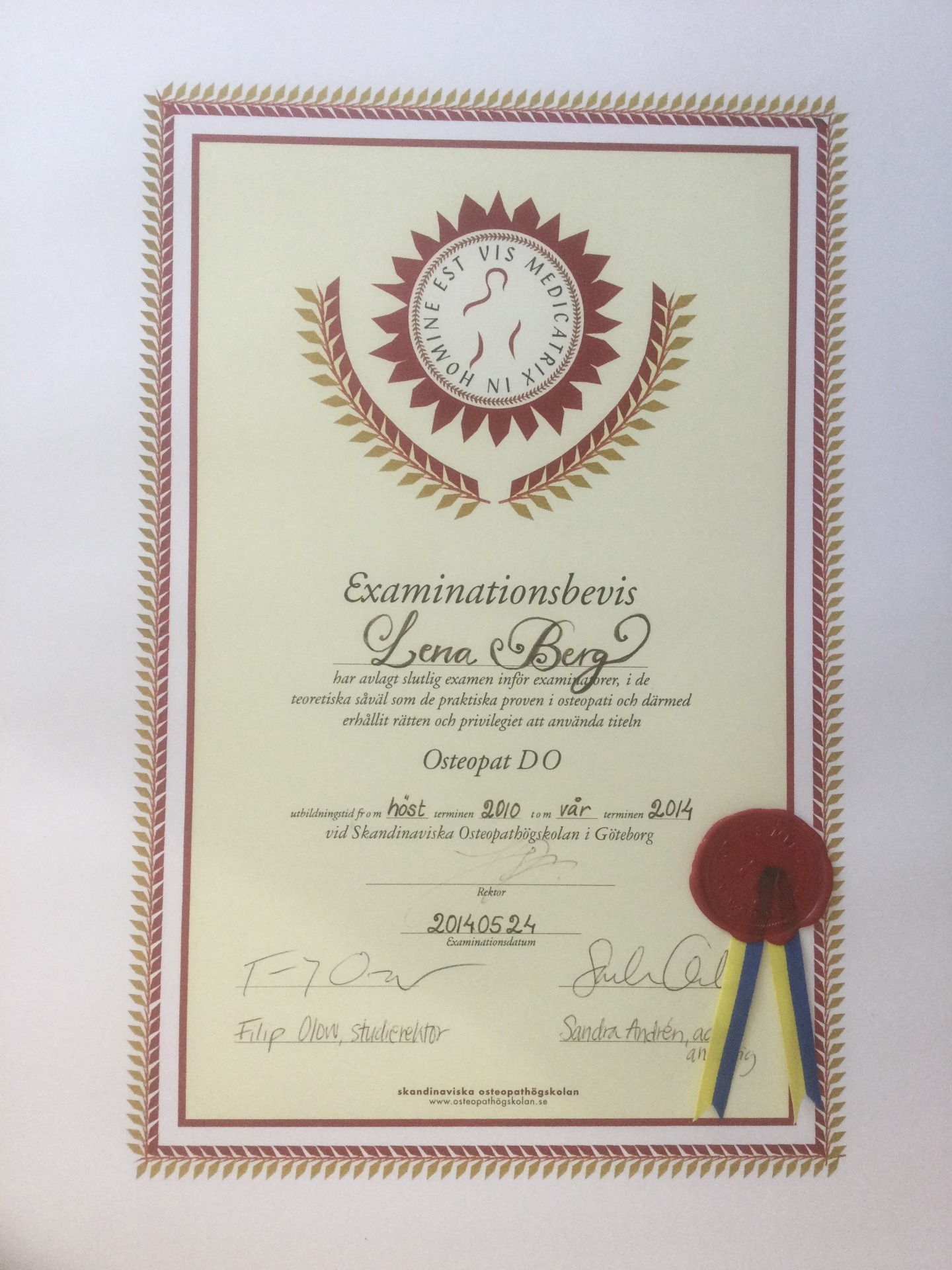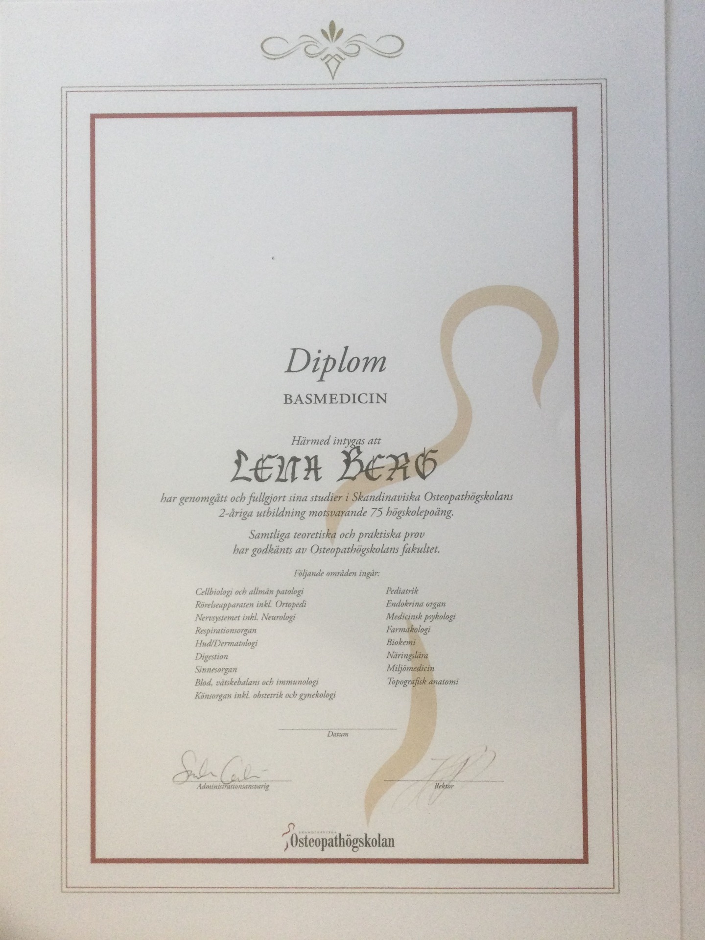 I completed my training as a Certified Massage Therapist (now called Medical Massage Therapist) in 2005 at Axelsons Institute in Gothenburg and graduated in Osteopathy from the Scandinavian School of Osteopathy in Gothenburg in 2014.